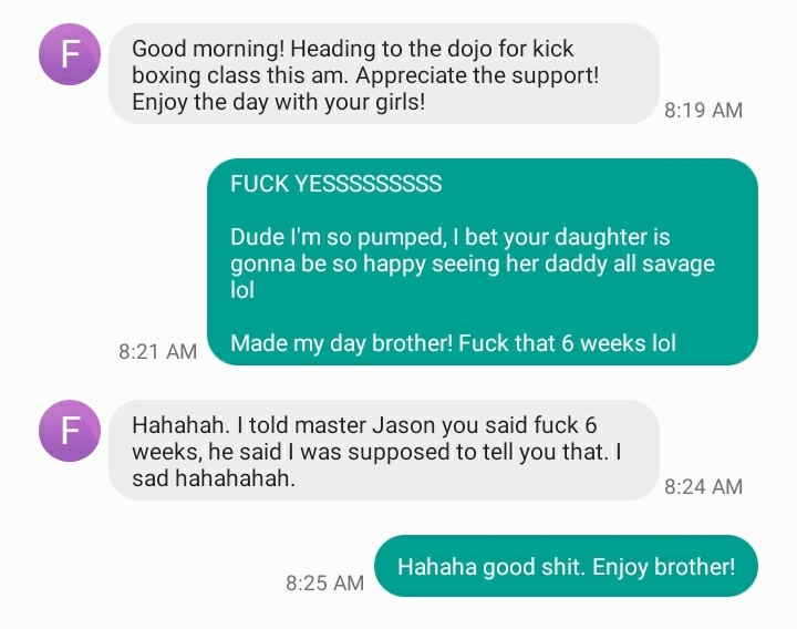 Luckily, he appreciated the challenge (that’s why I love him), got a smile on his face, and understood there’s some truth in those words. His daughter deserves seeing her father as a savage RIGHT NOW, not in 6 weeks or (more likely) NEVER.