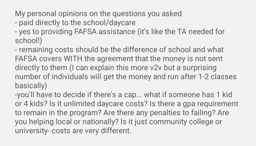 How much would be awarded? I mentioned paying for the ‘remaining costs,’ but that could vary by applicant and could be very significant. I’d want the amount of these scholarships to be enough to be meaningful.. For example, a $1,000 scholarship might not be enough to compel them to go to school (unless it’s the remaining amount after FAFSA, etc). $1,000 might not be enough to cover a meaningful part of childcare either. Although this could change, I think I’d like to shoot for these loans to be in the range of up to $10,000 and I’m not sure if this would be in total or per semester, or if they would have to re-apply after each year (with a minimum GPA requirement?).