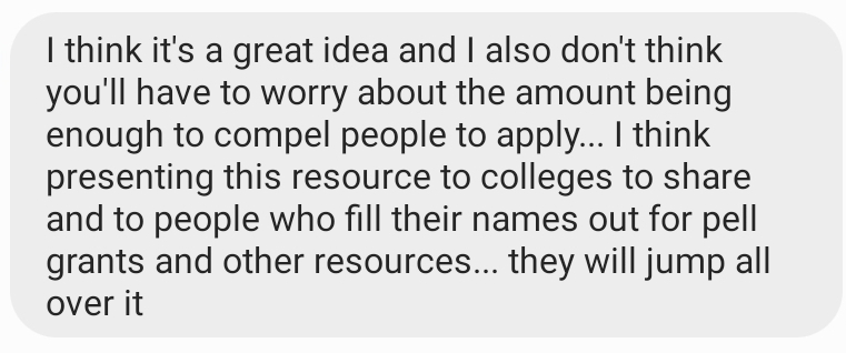 -We will also provide the resources to help applicants fill out the FAFSA form as well as other grant applications (like stafford / pell). This would really help them with the overall process and affordability of going to school, and our foundation would seek to cover the remaining costs after FAFSA / grant funds are awarded.
